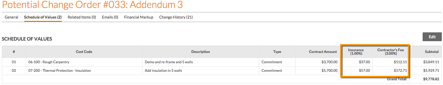垂直マークアップでは、価値表 (SOV) の項目の小計の後にマークアップ金額が表示されます。以下に示すように、保険 (1.000%) と請負業者の手数料 (3.000%) は別の行に含まれています。 パーセンテージ ベースの金額を使用する代わりに、一括マークアップ金額を入力する場合は、変更指示の小計をインラインで編集するだけです。